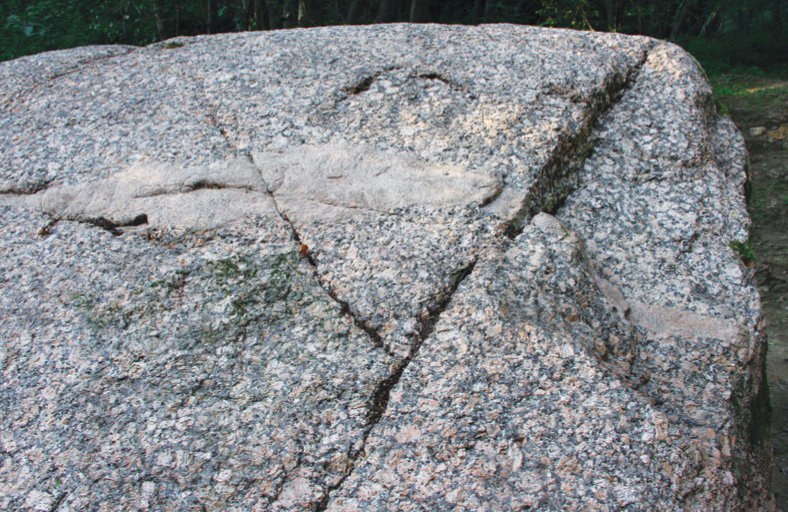 Этот гранитный исполин красноватого или слегка розового цвета блестит на свету вкраплениями кварца. По форме камень напоминает огромный коренной зуб или сжатый кулак.