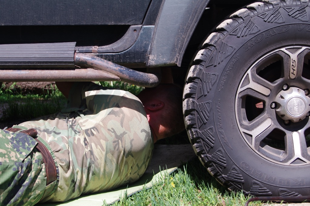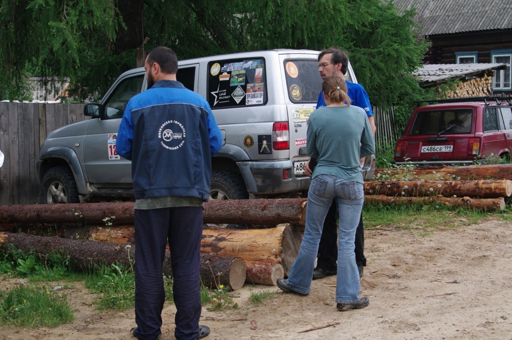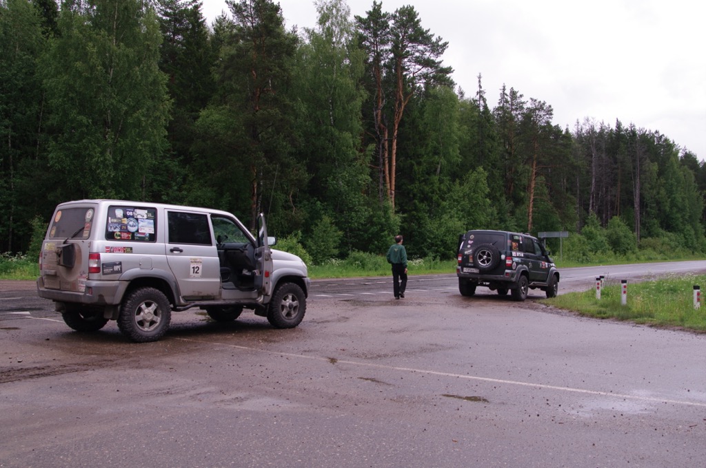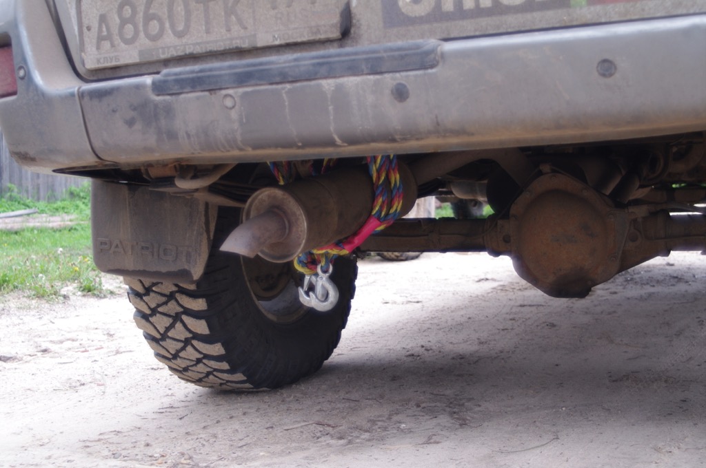 Вырываемся вперед, и поскольку Володя никак не мог ударить лицом в грязь перед таким опытным водителем как Андрей, на мой взгляд, скорость нашего передвижения еще увеличилась. Что естественно привело к последствиям…. Дорога в две полосы, навстречу фура, впереди лужа не известно какой глубины, т.е. стало известно когда мы в нее влетели, глубокая… Вобщем, хорошо так влетели. Андрей что-то говорит в рацию (кстати и рация плохо работала), понимаем только одно слово – глушитель. Пришлось остановиться, да оторвали крепление, сходили поискали его, это такая железная лента, и даже нашли, но по ней уже проехался кто-то. Скорость пришлось понизить, совсем уж оторвать глушитель как-то не хотелось. У меня уже стали закрадываться мрачные мысли о возможности отремонтировать глушитель в Кологриве, в праздничные дни, пришла к неутешительному выводу, что придется нам или без глушителя ехать в Москву, или зависнуть в Кологриве на неопределенное время. Но делать-то нечего, едем потихоньку, уже свернули в Мантурово, Кологрив все ближе, но тут Андрей опять по рации сообщает нам, что глушитель у нас окончательно болтается. Вылезает, смотрим, второе крепление тоже не выдержало. Надо чем-то крепить, первая мысль конечно о проволоке, но где ж ее возьмешь. Единственное, что приходит в голову привязать тросом. Валяется у нас в багажнике тросик типа буксировочный, который купили вместе с огнетушителем для прохождения ТО. Использовался этот трос один раз - для транспортировки бревна для пионерского костра. И второй раз пригодился - со второго раза глушитель был надежно закреплен и мы смогли двинуться дальше.