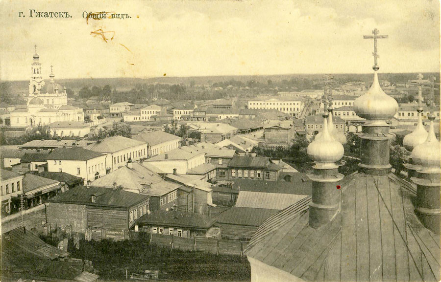 В 1910 году в уездном Гжатске проживало 10 тысяч человек. Город делился рекой на две почти равные части, а берега Гжати уже соединял красивый железный мост. При этом почти весь город был деревянным: из 862 жилых строений только 68 - каменных. Двухэтажные купеческие особняки стояли в основном на Мостовой улице – торговом центре города. В нижних этажах находились лавки и магазины, а в верхних размещались купеческие семьи. В то время их насчитывалось около ста.