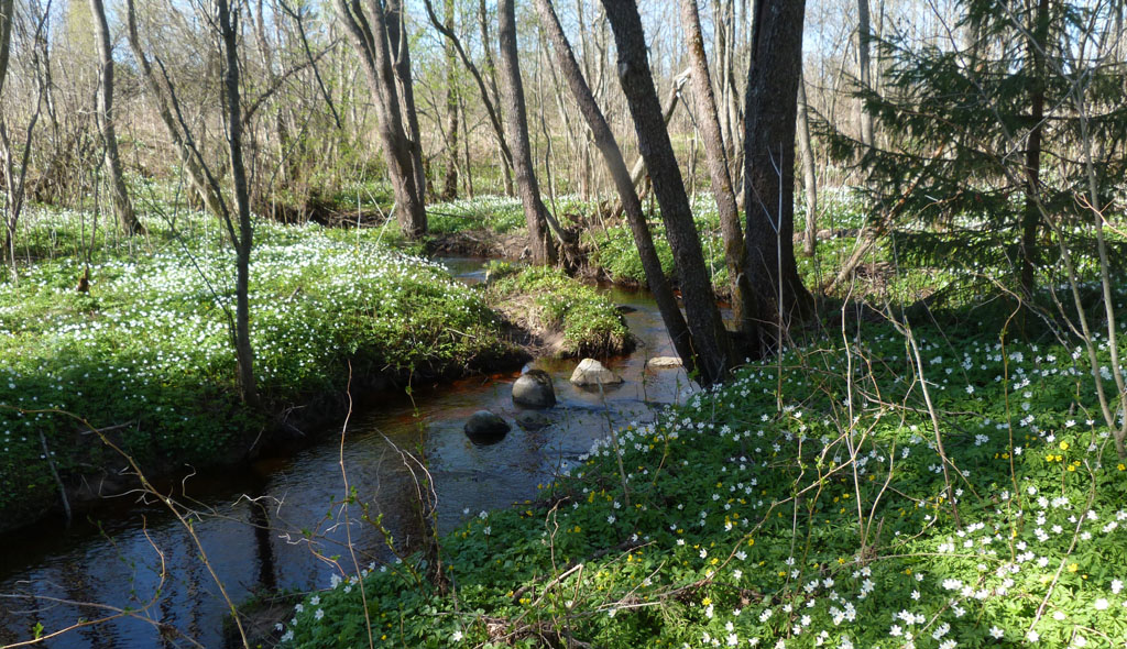 Ранней весной все окрестные леса становятся белыми от сплошного покрова цветущей ветреницы дубравной, а ольшаники по берегам ручьев и малых речек, впадающих в Двину, сплошь покрыты первоцветами – хохлатками, медуницей, ветреницей лютичной, селезеночником, гусиным луком. Но первый цветок, который сиренево-голубыми звездами расцветает в тенистых ельниках – печеночница благородная, также внесенная в Красную книгу. Вслед за ней по сухим соснякам и вырубкам зацветает сон-трава – прострел раскрытый. И, конечно берега и самой реки, и ее главных притоков – Торопы и Межи, окутаны дымкой цветущей черемухи, в ветвях которой, начиная со второй недели мая, запевают вернувшиеся из Африки соловьи. В конце мая сосняки по речным террасам и плакорам покрываются ландышами, и весь лес наполняется волшебным ароматом...