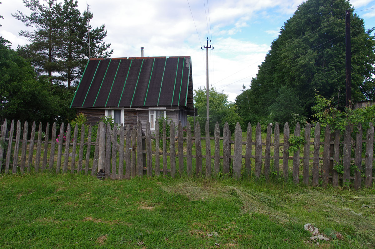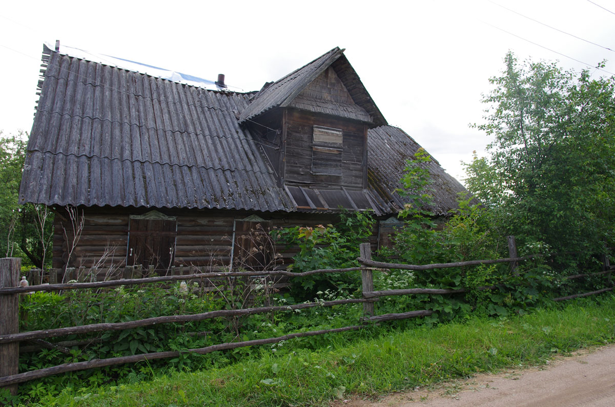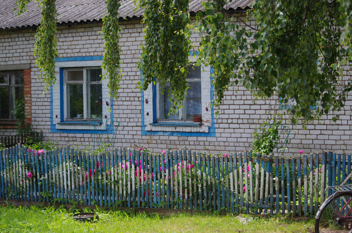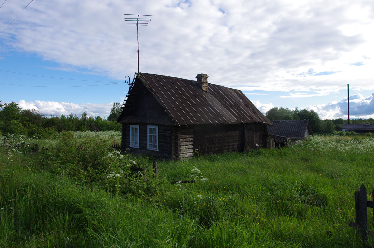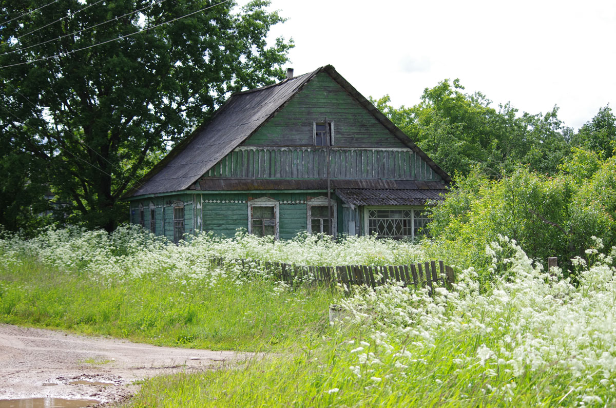 Деревня… При въезде поразили многоквартирные дома с заложенными кирпичом окнами, жуткое зрелище. Это был поселок торфозаготовителей, добыча торфа прекратилась — и вот они, последствия. Но дальше, за поселком, — деревня как деревня, с палисадниками, цветущими пионами в них.