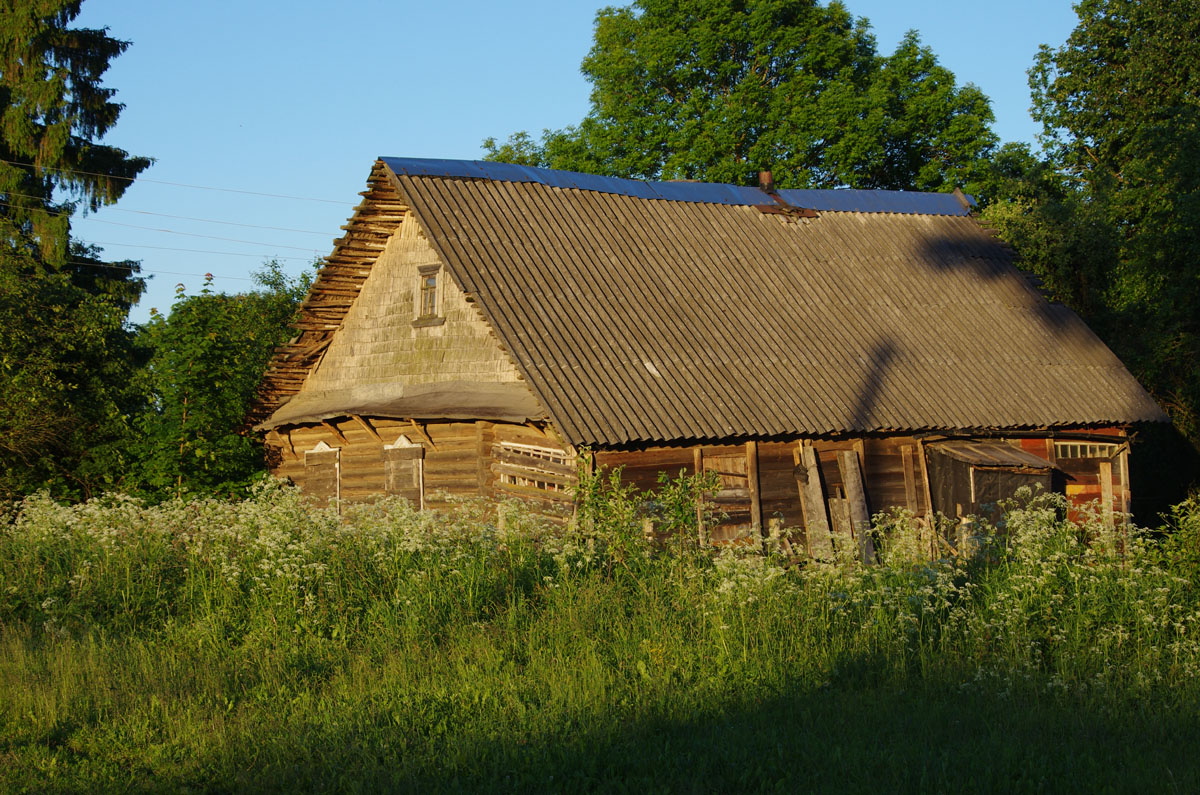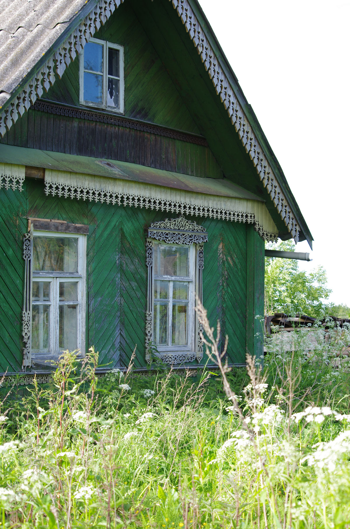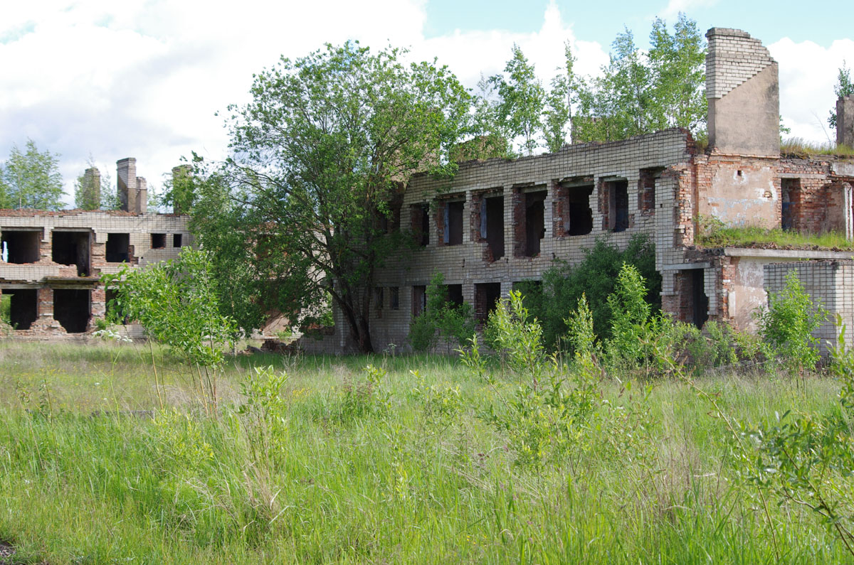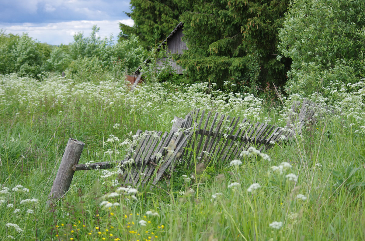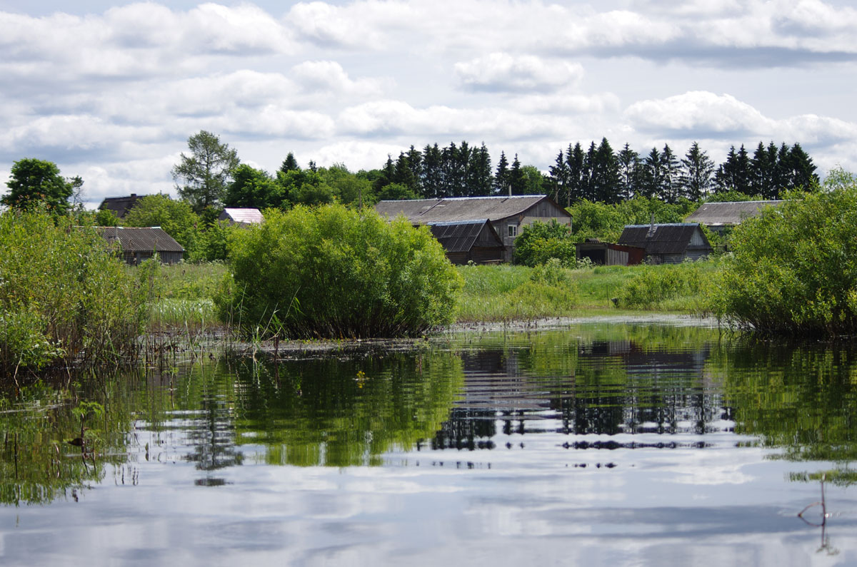 Деревня… При въезде поразили многоквартирные дома с заложенными кирпичом окнами, жуткое зрелище. Это был поселок торфозаготовителей, добыча торфа прекратилась — и вот они, последствия. Но дальше, за поселком, — деревня как деревня, с палисадниками, цветущими пионами в них.