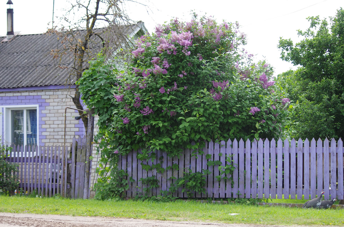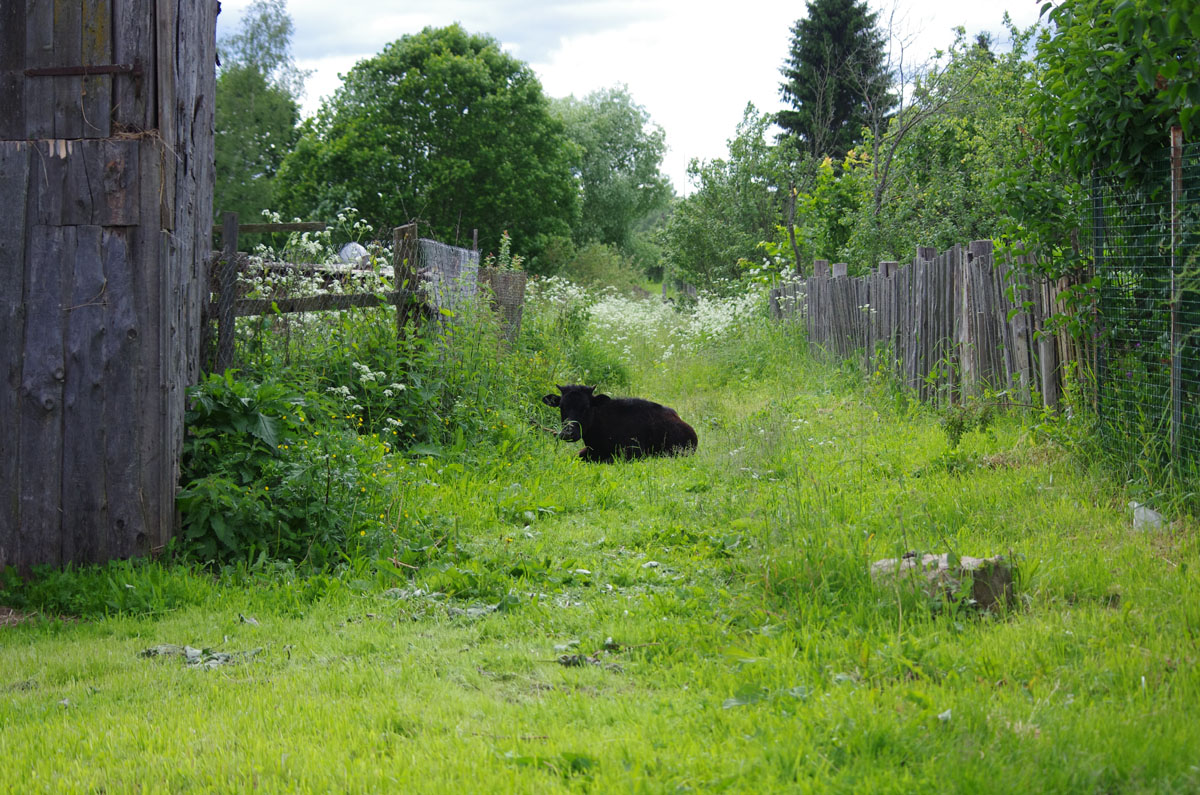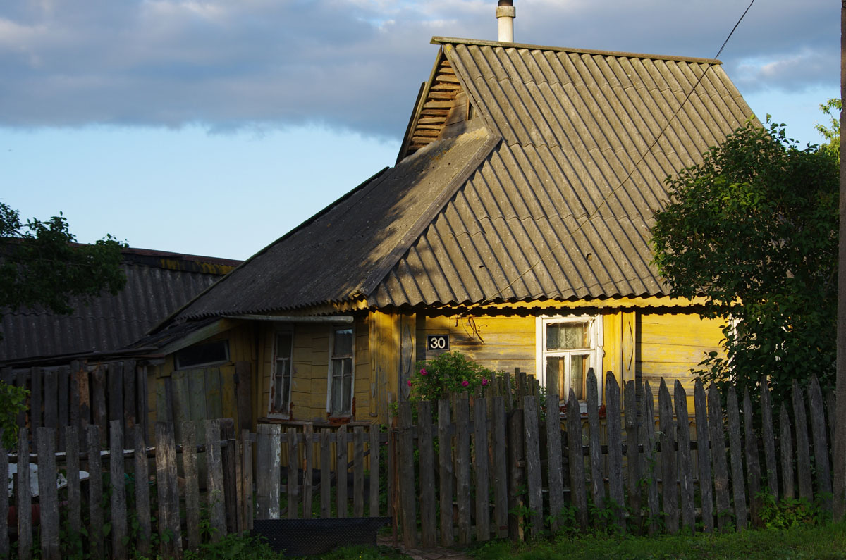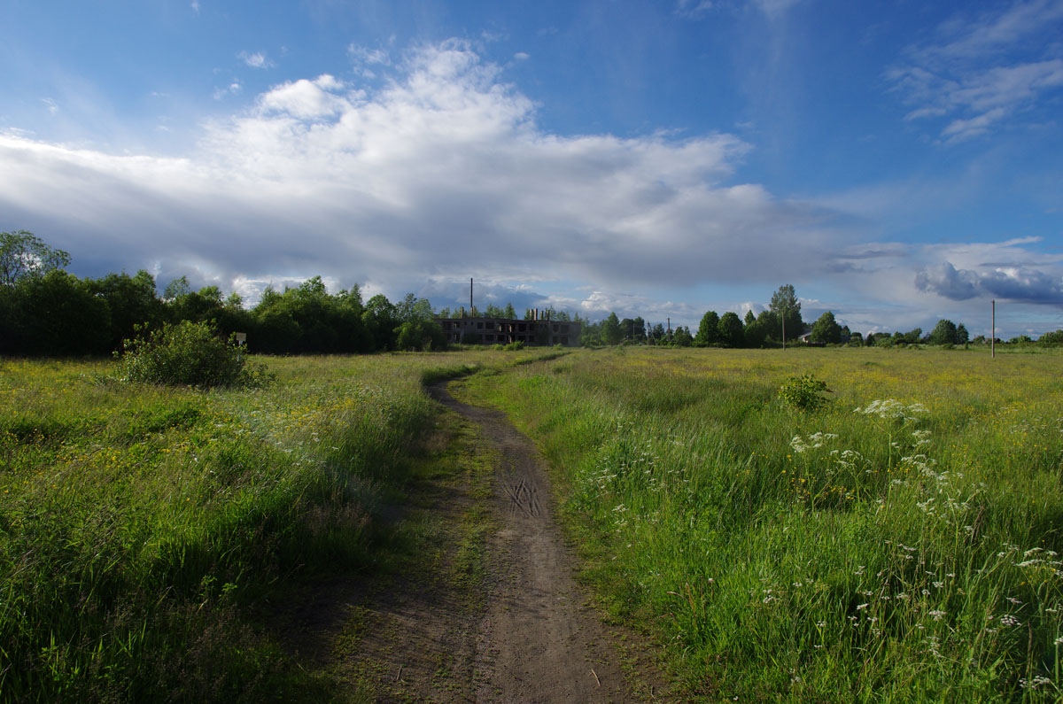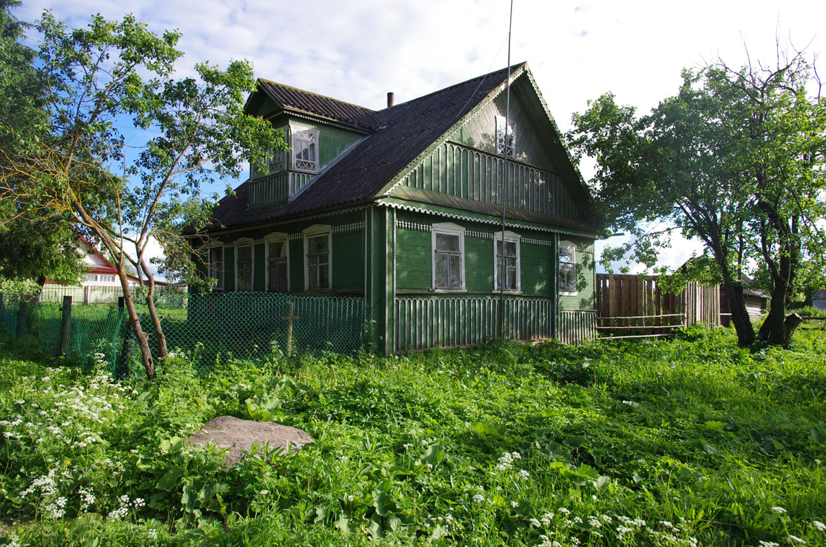 Деревня… При въезде поразили многоквартирные дома с заложенными кирпичом окнами, жуткое зрелище. Это был поселок торфозаготовителей, добыча торфа прекратилась — и вот они, последствия. Но дальше, за поселком, — деревня как деревня, с палисадниками, цветущими пионами в них.