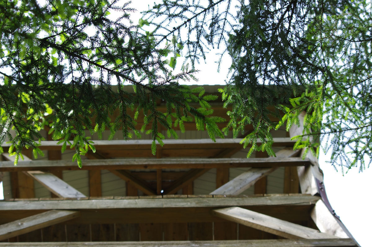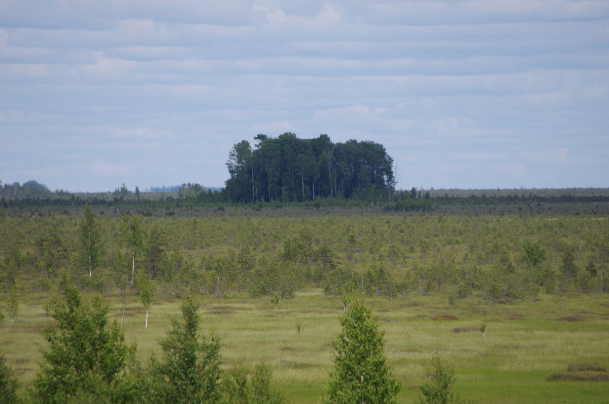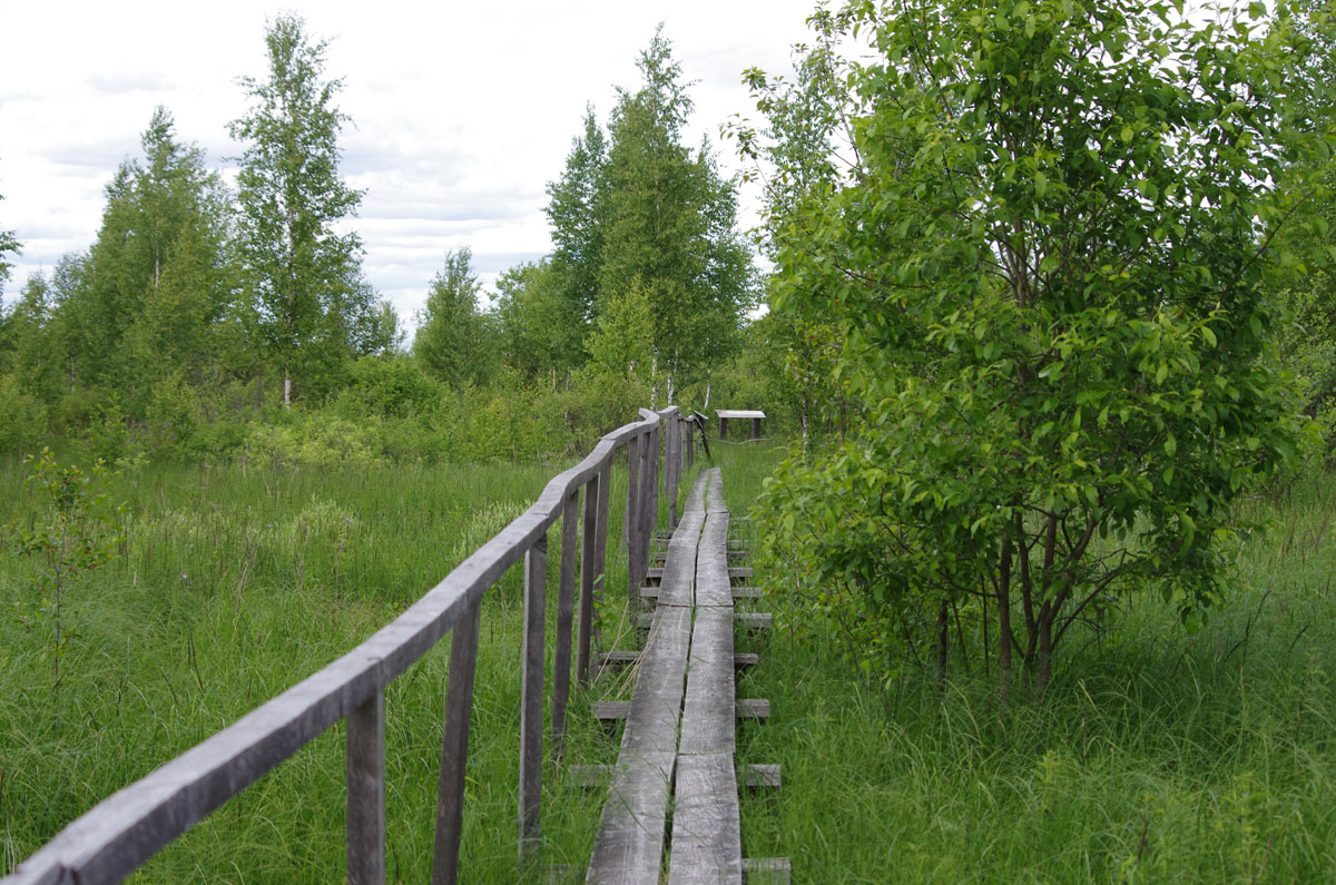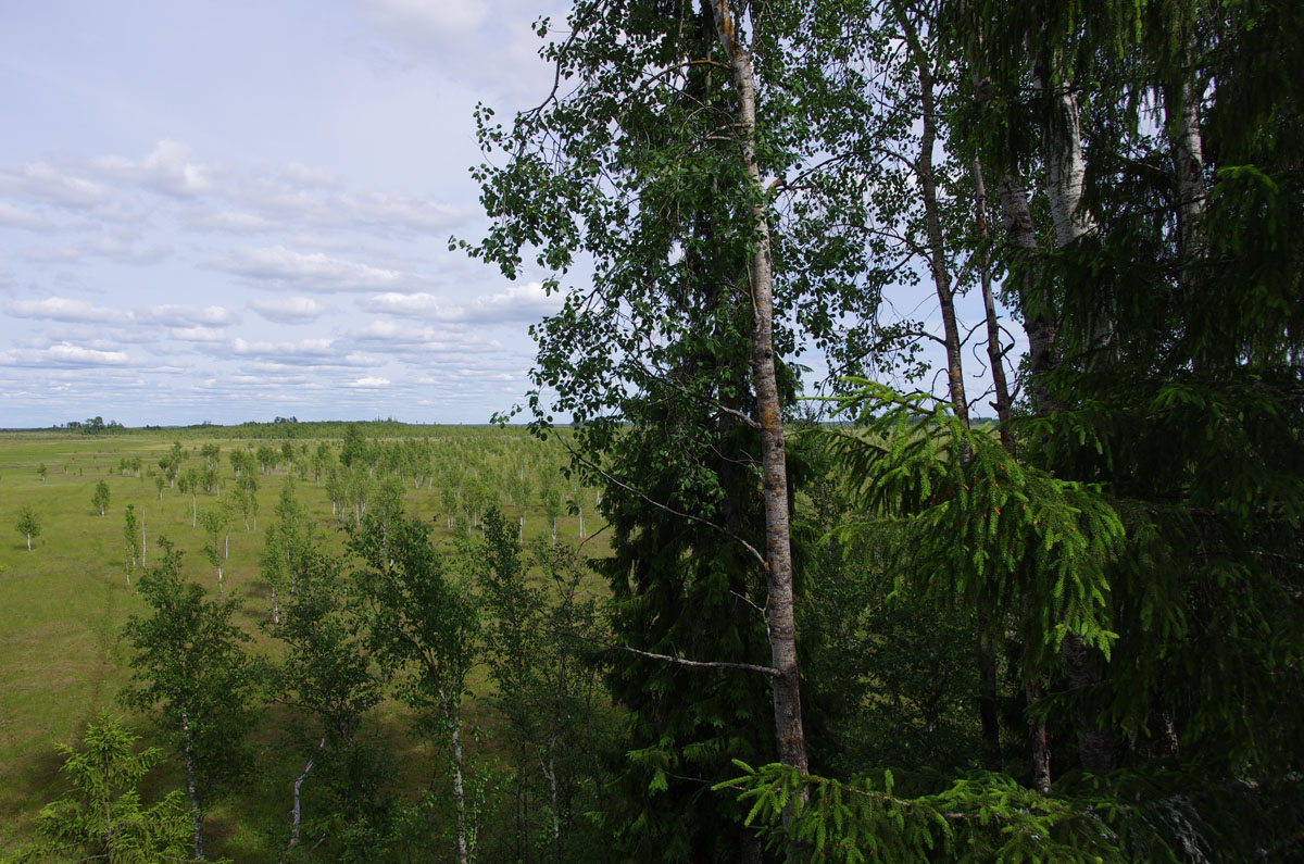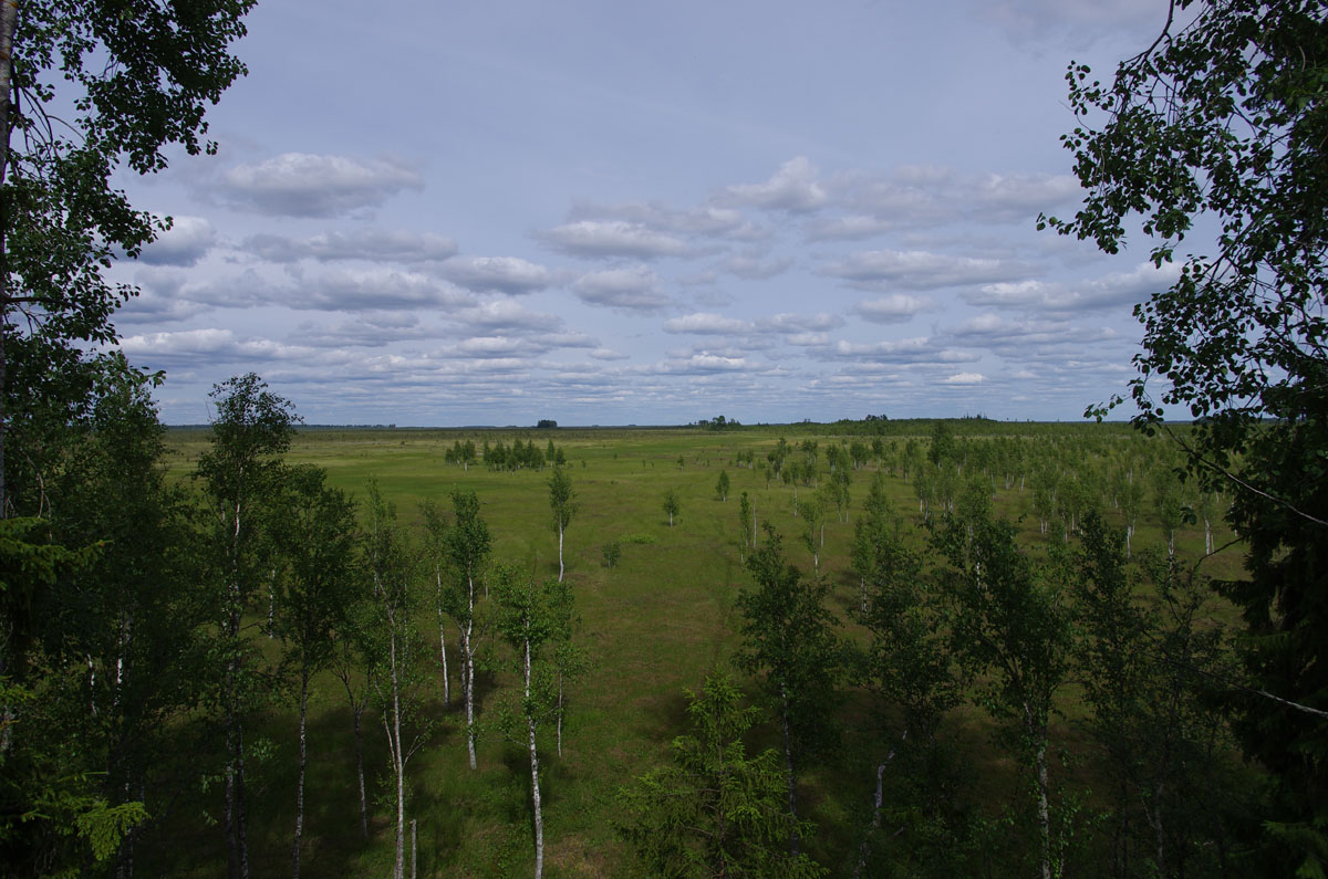 На болоте есть так называемые «острова», с настоящими лесом, а не теми чахлыми сосенками, которые растут на мокроте. На одном из таких островов, острове Еловый, установлена вышка. Забираться и особенно спускаться было страшновато, все же высота приличная, около 9 метров. Но оно того стоило: с вышки открывался прекрасный вид на бескрайние просторы болота.