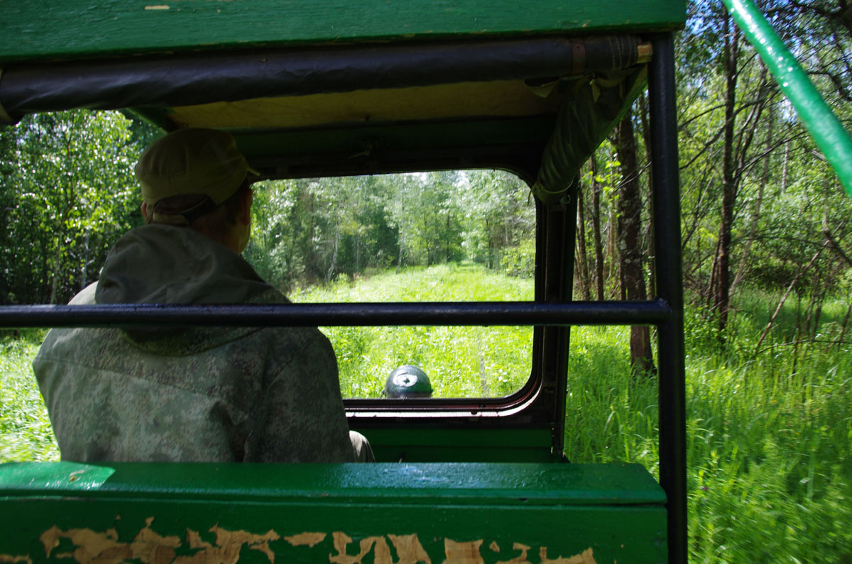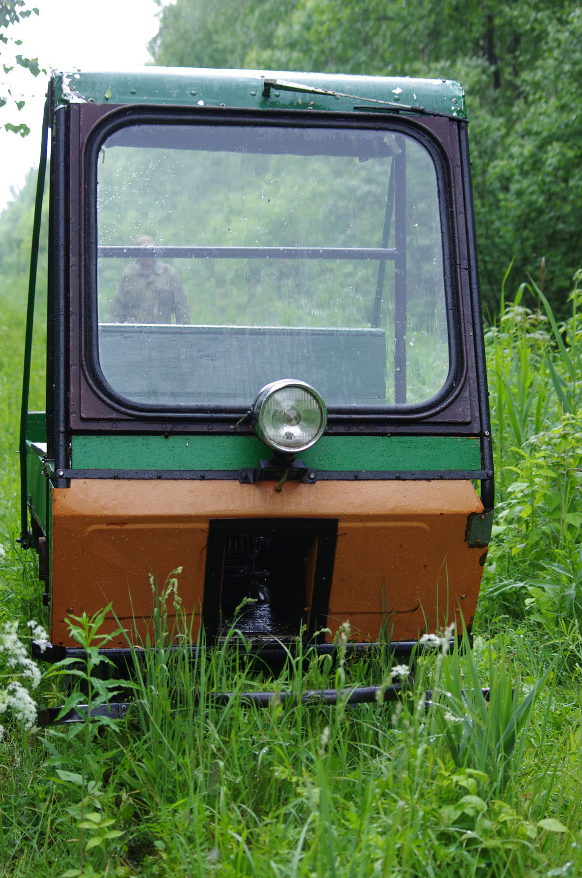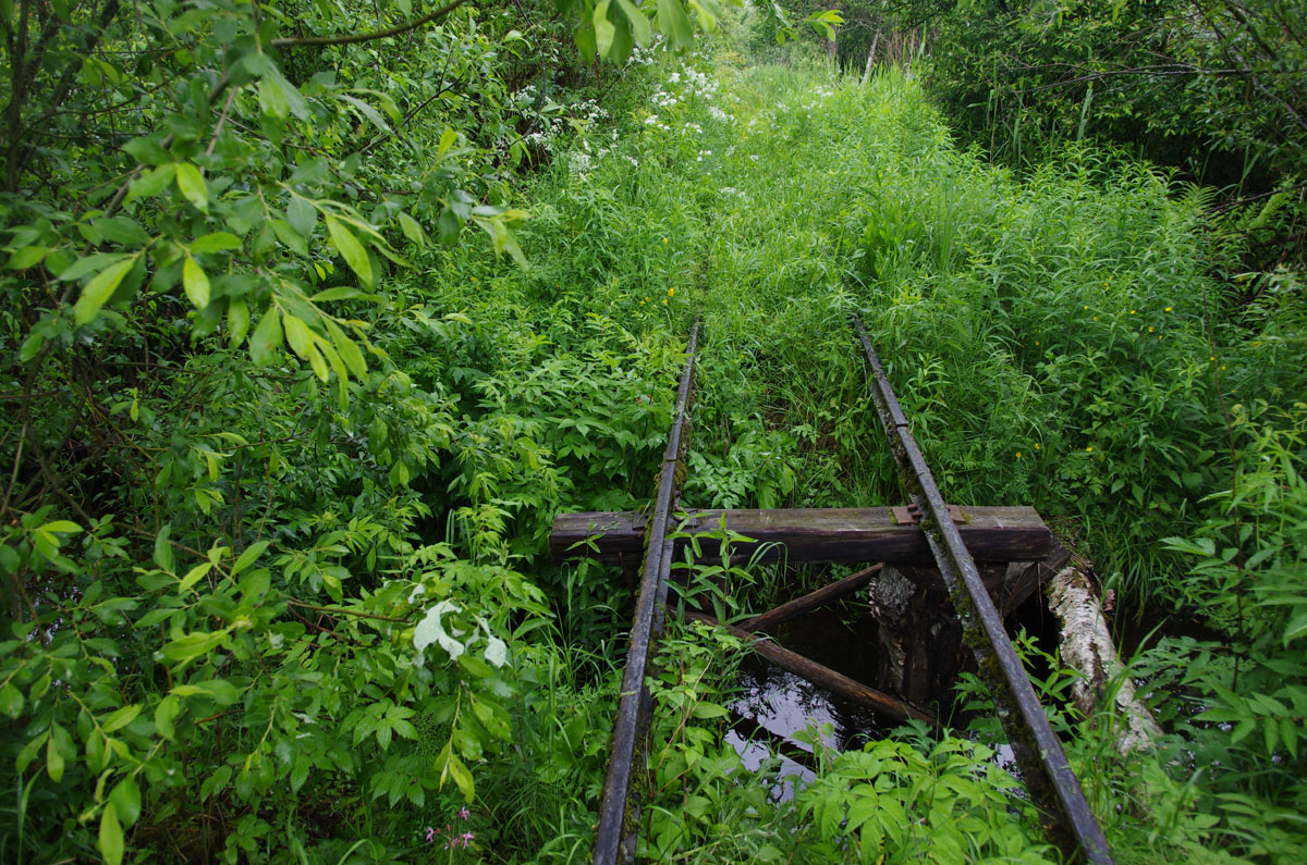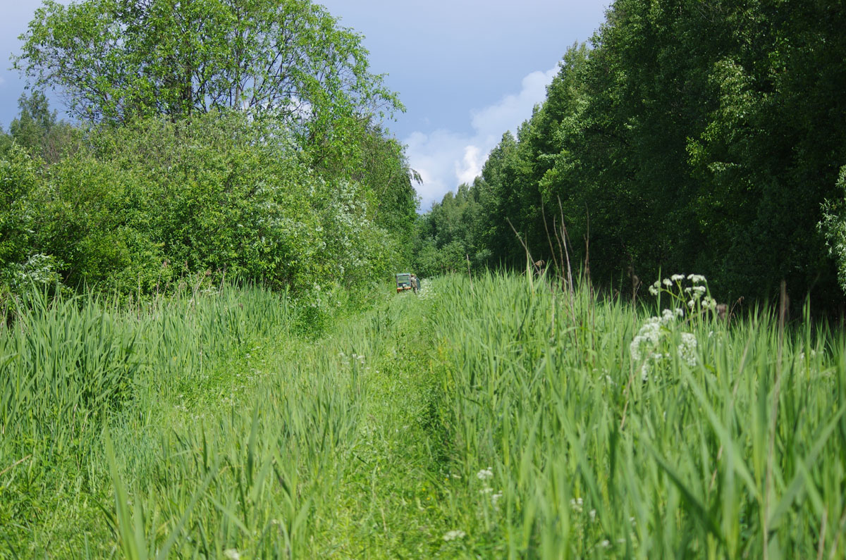 Всю ночь громыхала гроза и шел ливень. Поэтому утренняя экскурсия по узкоколейке не совсем удалась. Отросшая мокрая трава очень мешала движению дрезины. Мотор перегревался, приходилось останавливаться. Я использовала остановки для фотографирования окружающих видов, а наш экскурсовод и водитель (или все же машинист?) Павел — для приведения в порядок дороги.