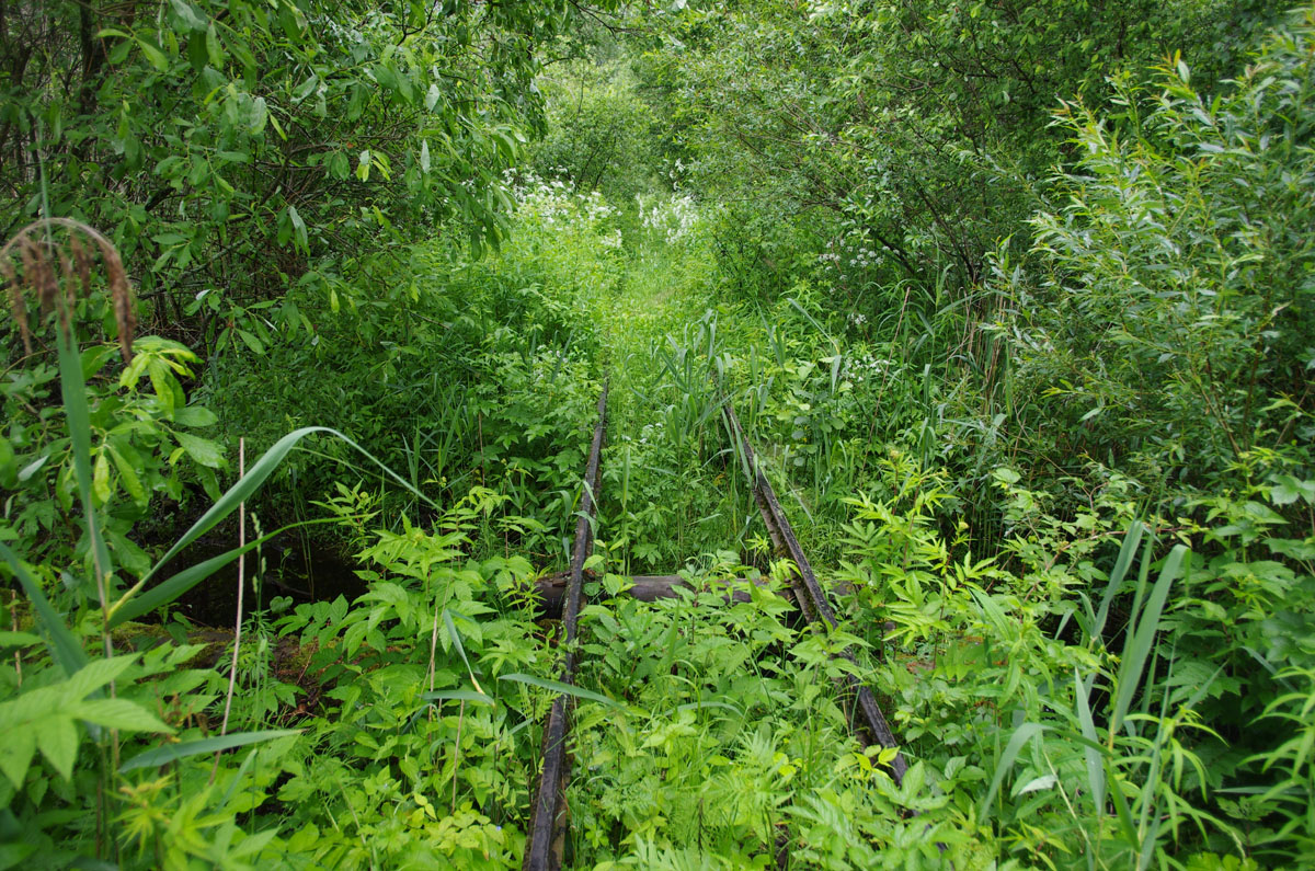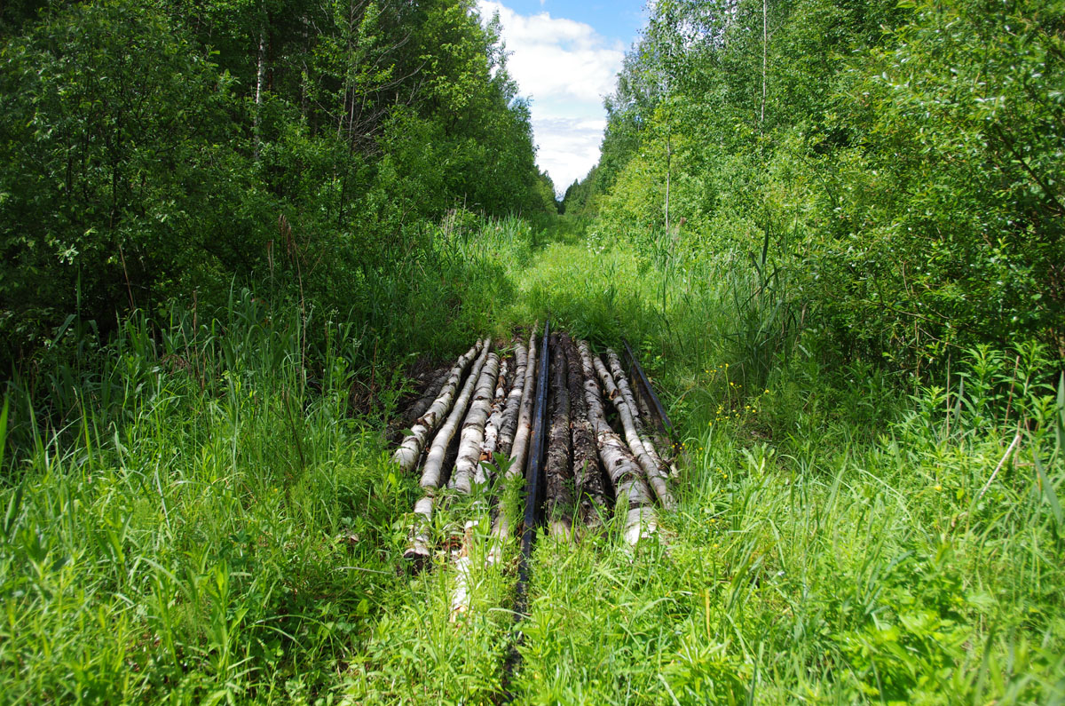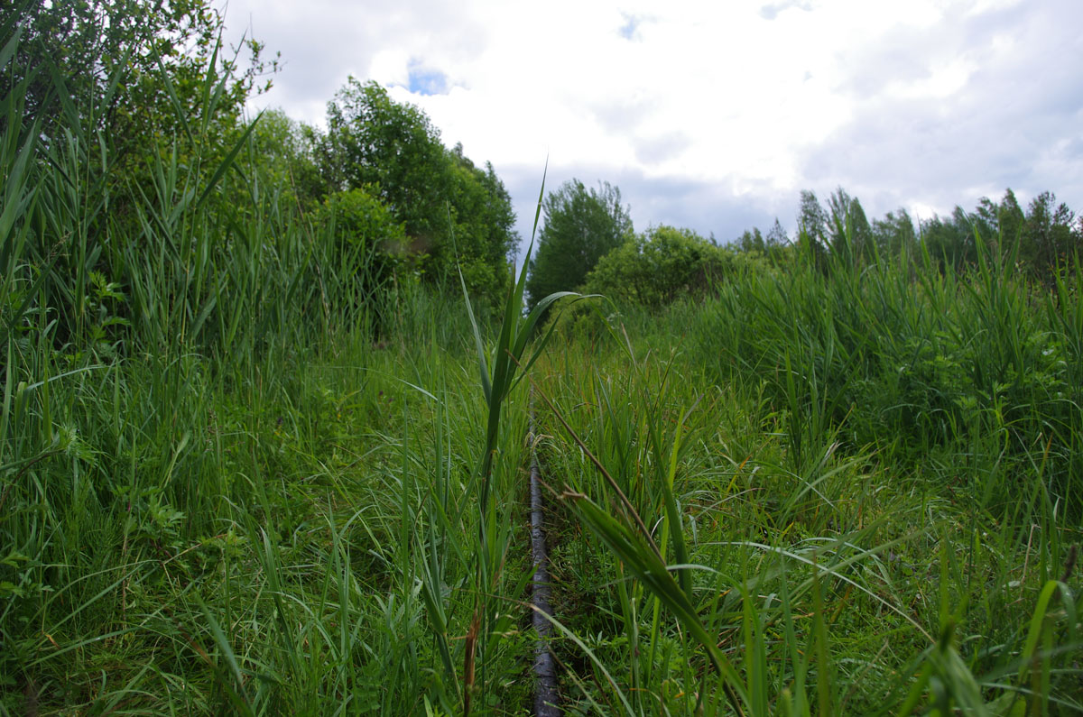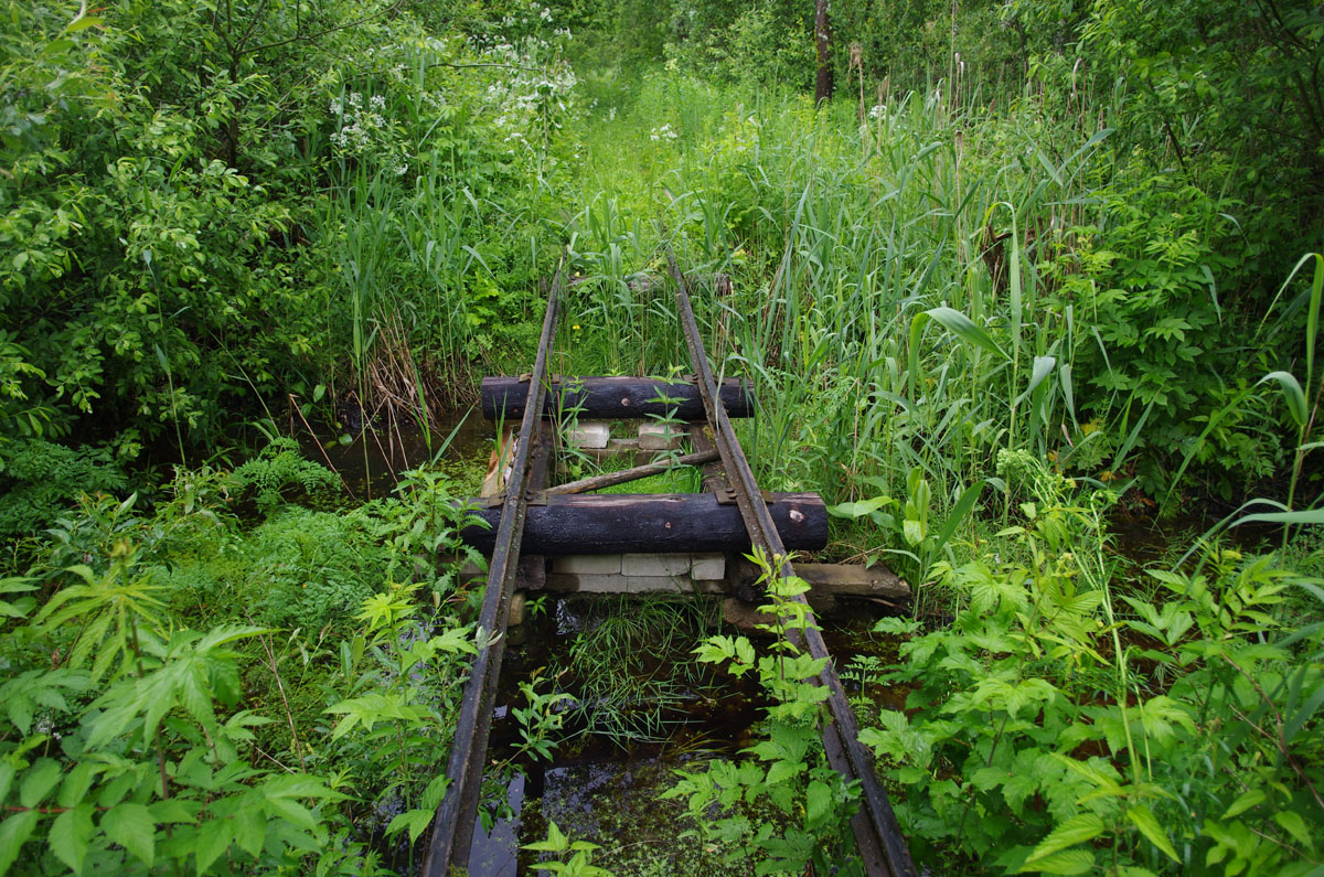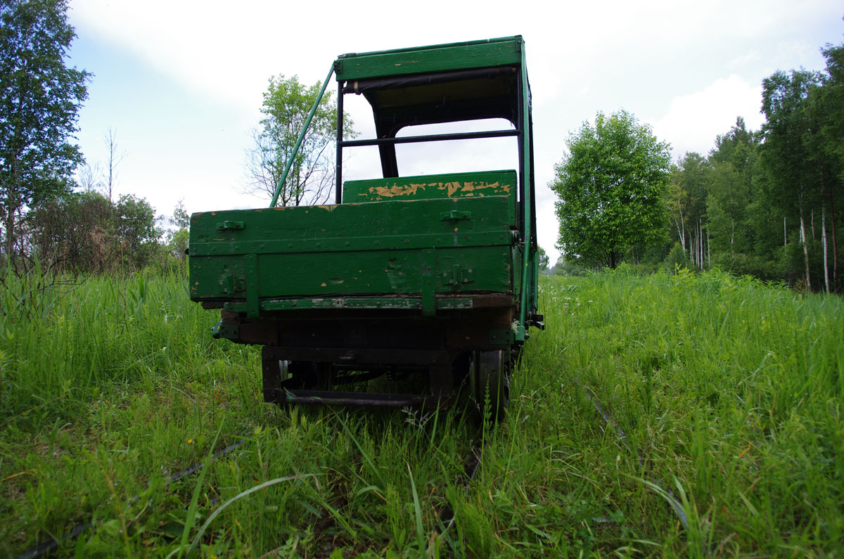 Всю ночь громыхала гроза и шел ливень. Поэтому утренняя экскурсия по узкоколейке не совсем удалась. Отросшая мокрая трава очень мешала движению дрезины. Мотор перегревался, приходилось останавливаться. Я использовала остановки для фотографирования окружающих видов, а наш экскурсовод и водитель (или все же машинист?) Павел — для приведения в порядок дороги.