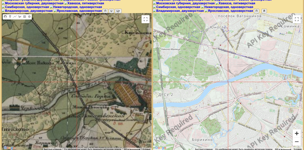Хорошим примером такой ошибки может послужить снимок экрана, приведенный ниже, который взят непосредственно с сайта одного из проектов авторов. В правой его части на современной карте отмечена перекрестием примерная середина железнодорожного моста через Волгу в г. Тверь. Здесь есть исключение из того, что я говорил выше: достоверность того, что этот же мост изображен на карте Менде не вызывает сомнений, мост построен в 1849 г., а история его реконструкций также хорошо известна. Не вызывает сомнений и положение русла реки внутри или рядом с исторической застройкой. Однако, если мы с вами посмотрим на то же перекрестие в левой части изображения (с исторической картой), то увидим, что все изображение смещено с севера на юг почти на 400 метров.