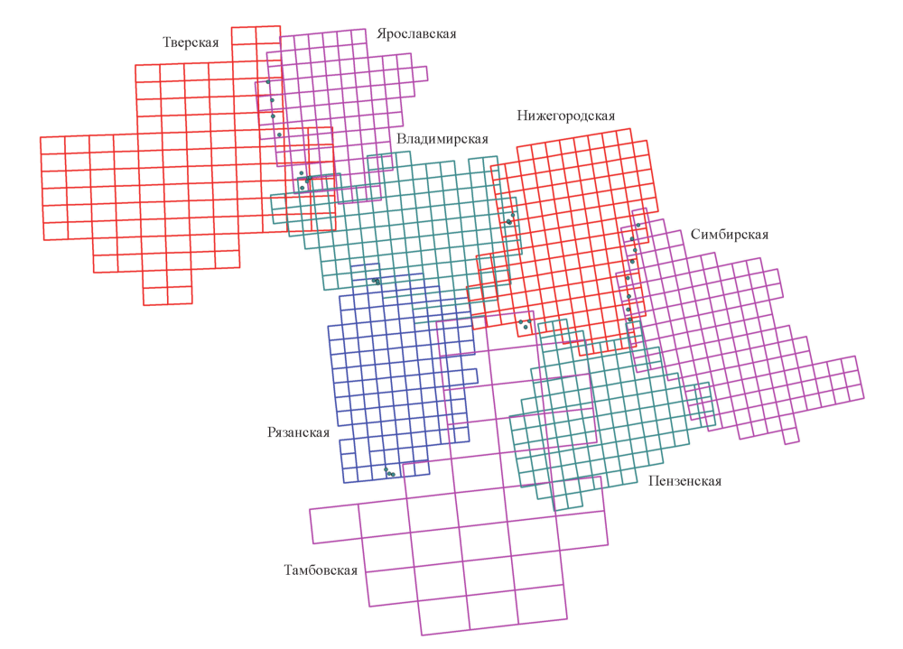 Часть проделанной авторами работы схематично изображена на рисунке ниже, взятом из статьи [5]. На нем приведены сетки всех карт Менде по поволжским губерниям. Не должны удивлять разные размеры для ячеек сетки: для каждой многолистовой карты по определенной губернии они индивидуальны. Кроме того, индивидуален и поворот сетки относительно сетки координат общей проекции, в которой изображена эта сводная карта, поскольку каждая группа оригинальных листов имеет свои, индивидуальные параметры проекции (в частности, центральный меридиан, к которому жестко «прикреплена» сетка листов).