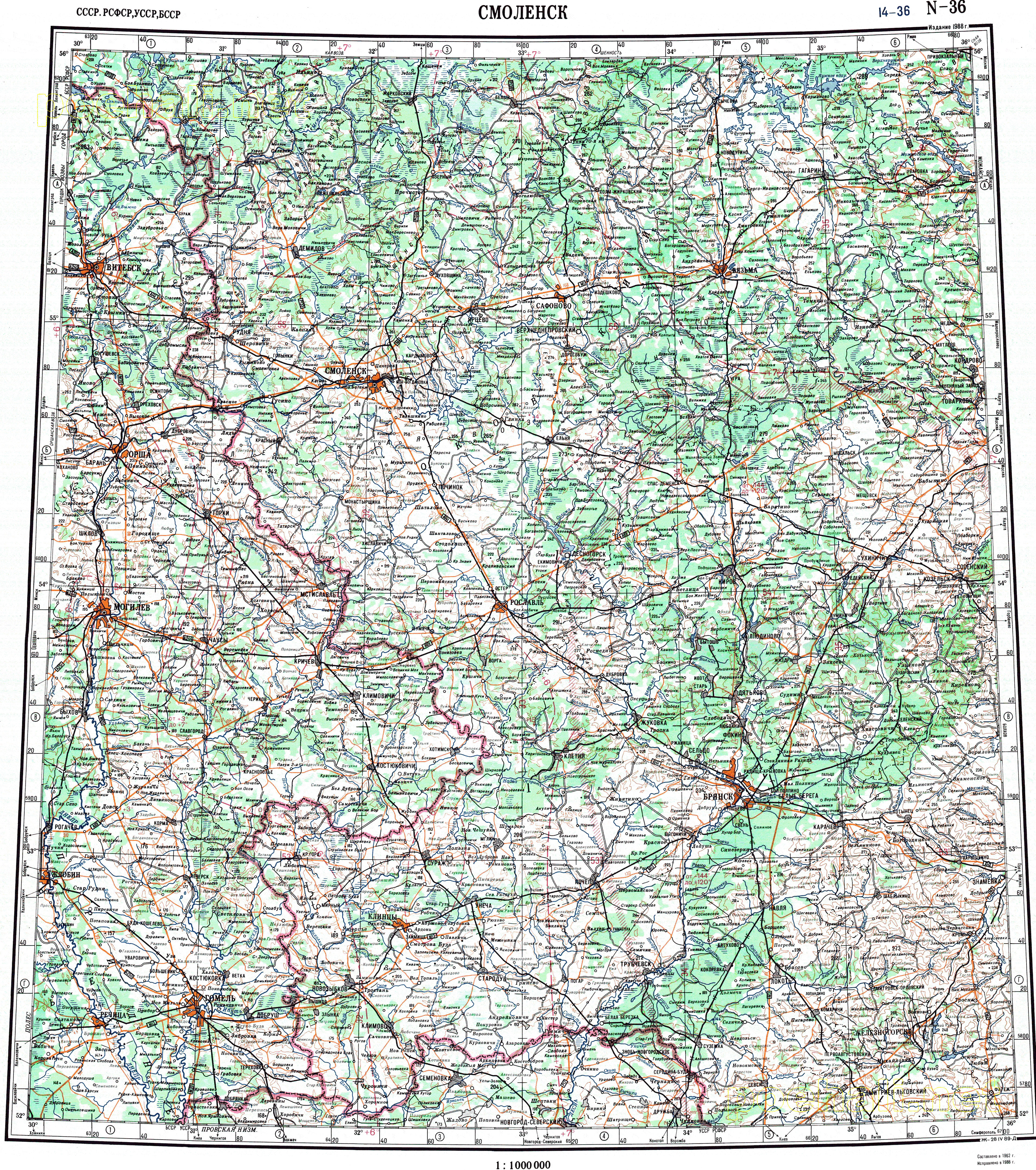 Чтобы окончательно понимать, о чем в дальнейшем пойдет речь, всегда полезно иметь перед глазами некоторый визуальный пример. В качестве такого примера дальше в этой и следующих двух главах мы с вами будем рассматривать участок местности (земного сфероида), ограниченного по широте параллелями в 52° и 56° с.ш., а по долготе — меридианами в 30° и 36°. Тем, кто когда-нибудь сталкивался с топографическими картами XX века, такое ограничение хорошо знакомо: оно обозначает один из листов «миллионной» (то есть масштаба «в одном сантиметре 10 км») карты, а именно карты номенклатуры N-36, которая и приведена на рисунке ниже. Почему мы будем рассматривать среднемасштабную а не крупномасштабную карту? Ответ прост: чем мельче масштаб карты, тем нагляднее проявятся те эффекты проекций, о которых в дальнейшем пойдет речь.
