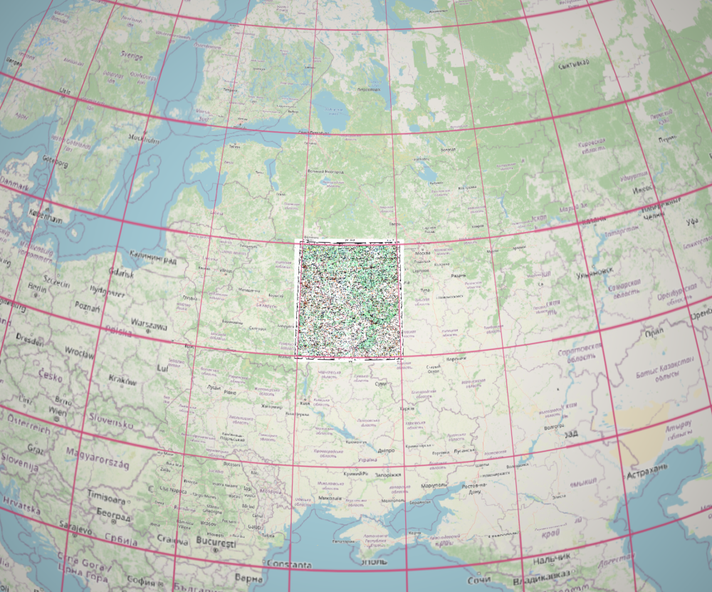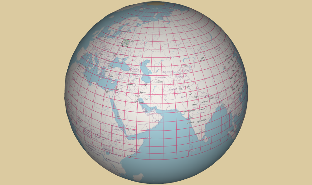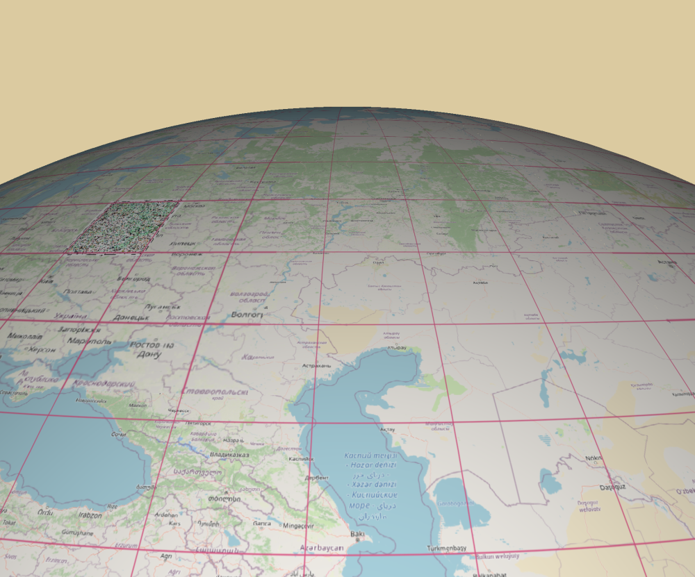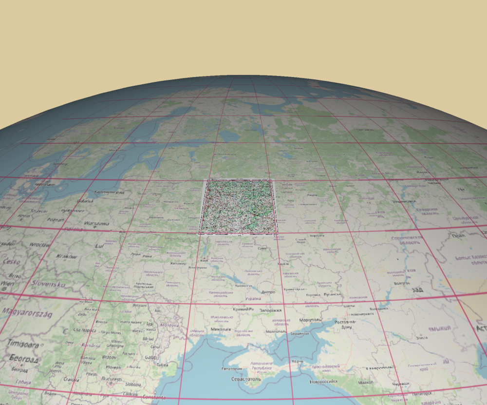 С недавних пор в QGIS существует свой встроенный «глобус» для трехмерного изображения карт, им мы и воспользуемся. Добавим на него для наглядности карту-подложку OSM, а также географическую (картографическую, градусную) сетку. Шаг сетки выберем равным границам исследуемого участка, то есть, параллели проведем через 4°, а меридианы — через 6°. Для дальнейшей наглядности отображения вида проекций ограничим сетку по долготе меридианами 0° и 180°, а по долготе — параллелями 0° и 84°, то есть возьмем восточную половину северного полушария. Вид получившегося глобуса вместе с исследуемым участком изображен на рисунке ниже.