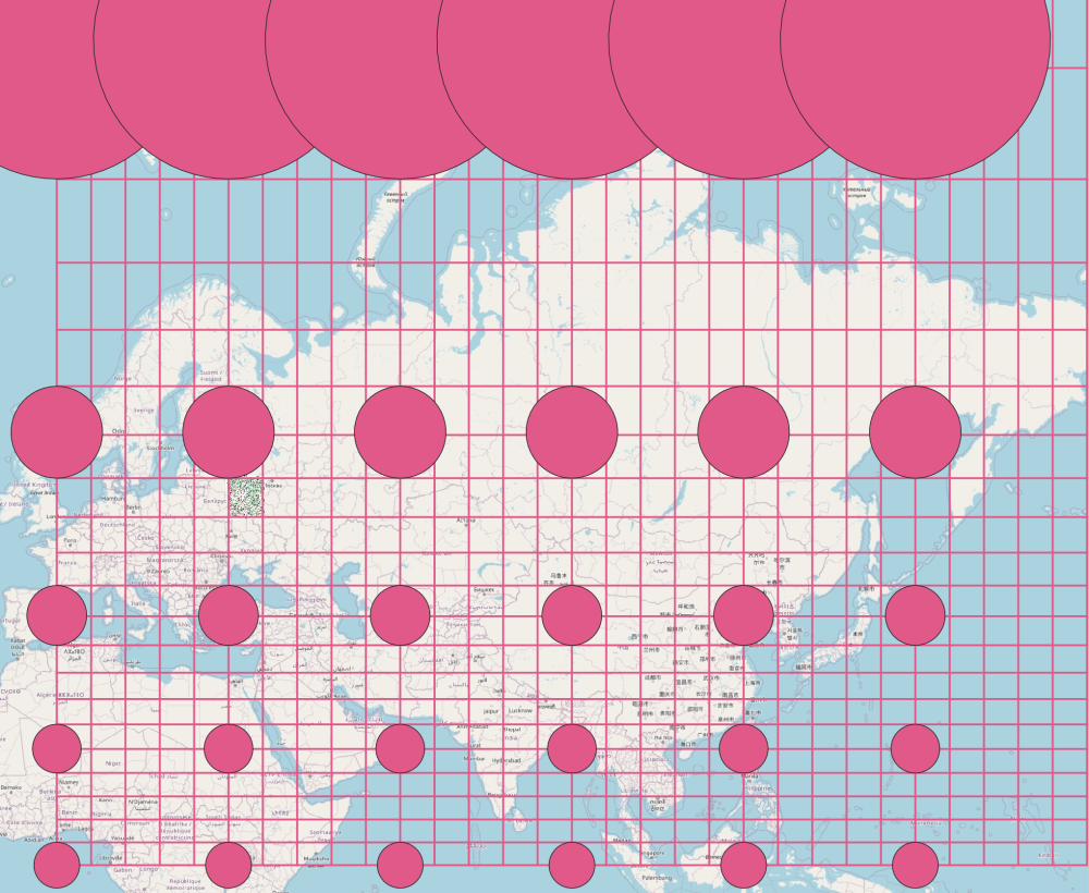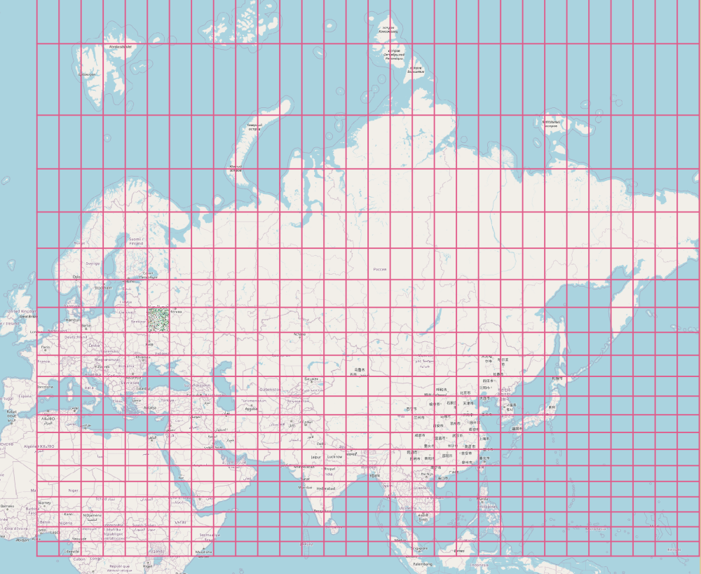 А на следующем рисунке построены те же сетки и с тем же шагом, но для системы координат EPSG:3857. Из этого рисунка видно, что смещения вертикальных линий координатной сетки не происходит, а вот горизонтальные — смещаются. Это говорит о том, что масштаб по меридиану (величина m) для этой системы координат немного уменьшается относительно «чисто меркаторской», а масштаб по параллели — остается таким же. Это и есть нарушение равноугольности.