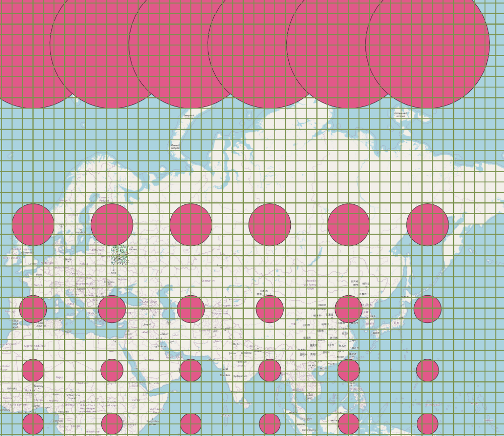- В базовом варианте QGIS инструмента для построения эллипсов искажений нет. Но есть отдельный удобный модуль, которым после установки мы с вами и воспользуемся. Он называется Indicatrix mapper и позволяет гибко настраивать параметры и внешний вид индикатрис. В качестве базового размера (радиуса исходной окружности) выберем 445 км, что соответствует 4° дуги экватора (для сфероида WGS84); как мы с вами помним — линия экватора в проекции Меркатора не искажает длин.