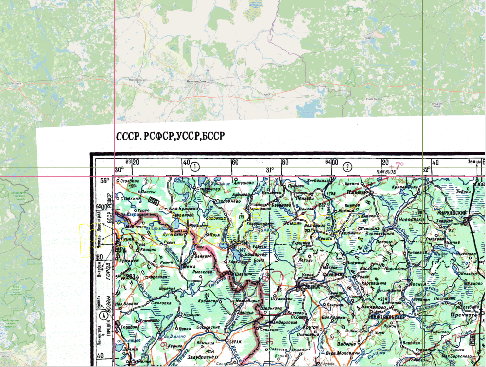 Однако стоит повторить: это видимое смещение линии сетки (примерно в полтора десятка километров) «набежало» на всем расстоянии рассматриваемого нами участка от экватора, оттуда, где находится начало отсчета. На типичных для крупномасштабных карт расстояниях речь идет о разнице между двумя проекциями примерно в «метры на километры», что хорошо видно на еще одном рисунке ниже, на котором показан тот же фрагмент местности, что и в предыдущем параграфе. Из рисунка видно, что он практически полностью идентичен приведенным ранее.