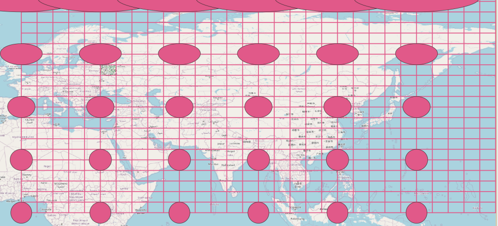 Давайте теперь посмотрим на то, как выглядят эллипсы искажений в обсуждаемой проекции Меркатора. Для этого построим их на диапазоне сетки, выбранном нами ранее [5], через каждые 20° по широте и 30° по долготе [6].